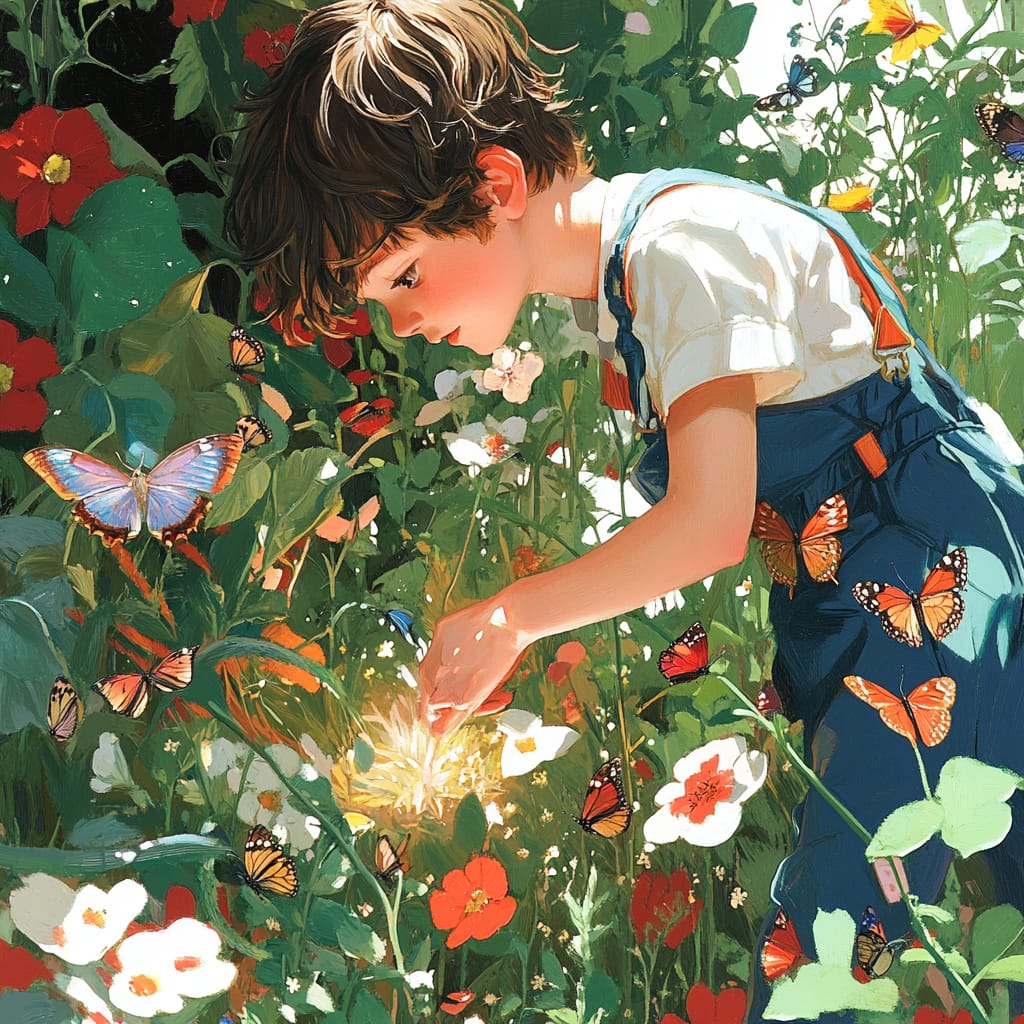 - An overgrown garden with vibrant flowers and twisting vines, where a young boy dressed in overalls tends to a glowing plant, surrounded by butterflies and sparkling dew, with the golden light of dawn creating a serene, magical atmosphere --sref 595165858 --v 6.1 --stylize 200