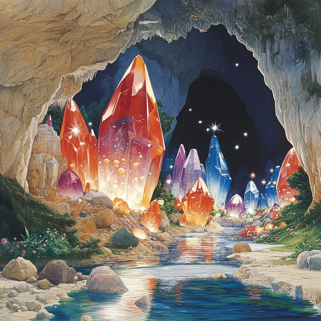 - A luminous cave filled with giant glowing crystals of various colors, their reflections casting ethereal patterns on the walls, while sparkling streams of water flow gently through the cavern --sref 595165858 --v 6.1 --stylize 200