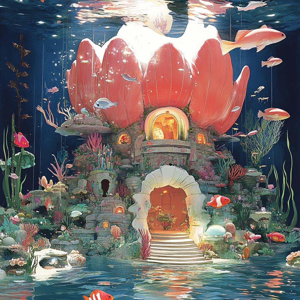 - A fantastical underwater kingdom with vibrant coral structures, glowing fish, and a central castle shaped like a giant seashell, illuminated by warm golden light beams penetrating the water’s surface, creating a surreal yet detailed environment for animation --sref 595165858 --v 6.1 --stylize 200