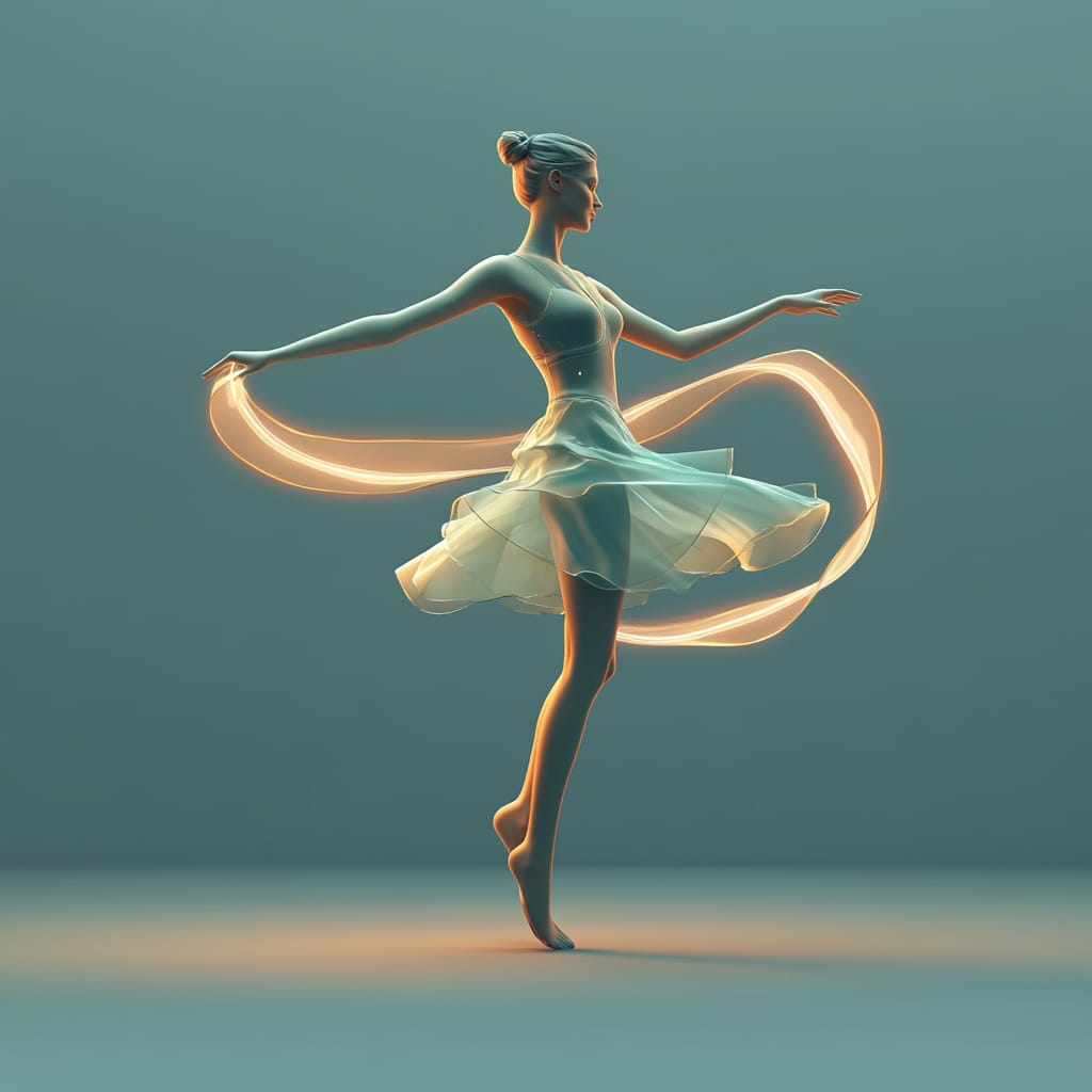 - A surreal silhouette of a dancer formed from intertwining ribbons of light; her movements trail streaks of luminescent colors against a dark background --sref 368005234 --stylize 200