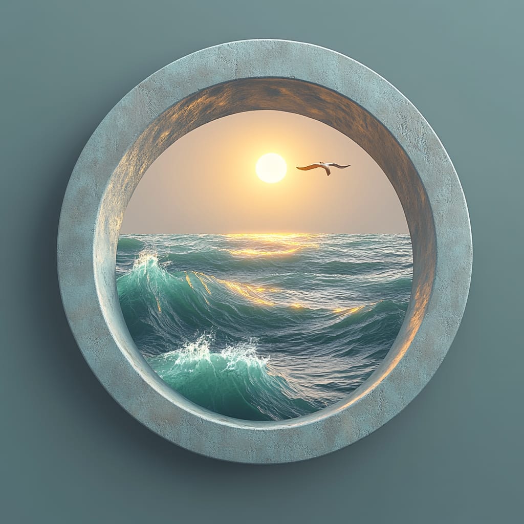 - A circular stone portal revealing a surreal seascape bathed in golden sunlight; waves crash dramatically as a lone bird soars toward the glowing horizon --sref 368005234 --stylize 200