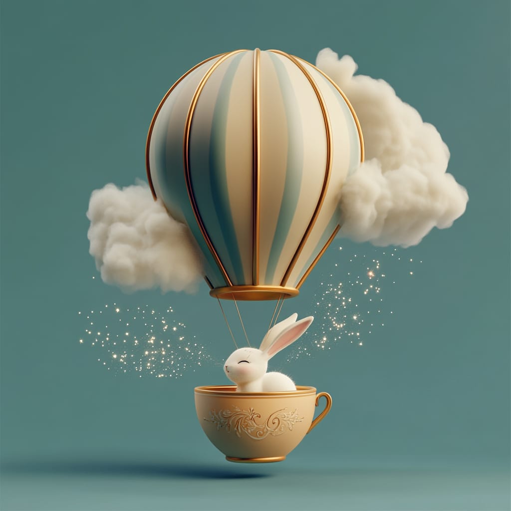 - A magical hot air balloon shaped like a teacup, piloted by a cheerful rabbit; trails of sparkling stardust follow its path across a pastel sky --sref 368005234 --stylize 200