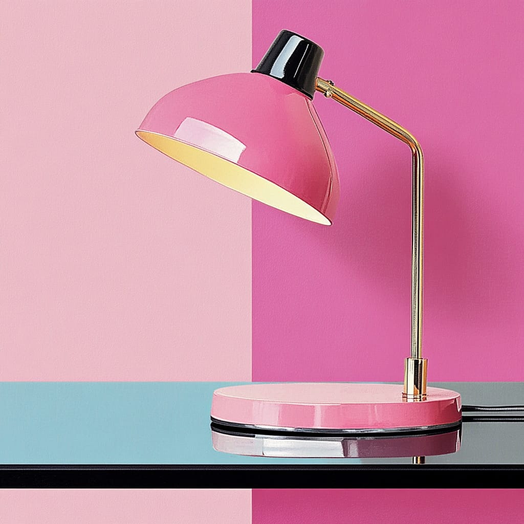 - A modern desk lamp in blush pink with gold accents, sitting on a glossy glass surface, illuminated against a minimalistic pastel wall with soft, diffused light --sref 463788918 --v 6.1 --stylize 200