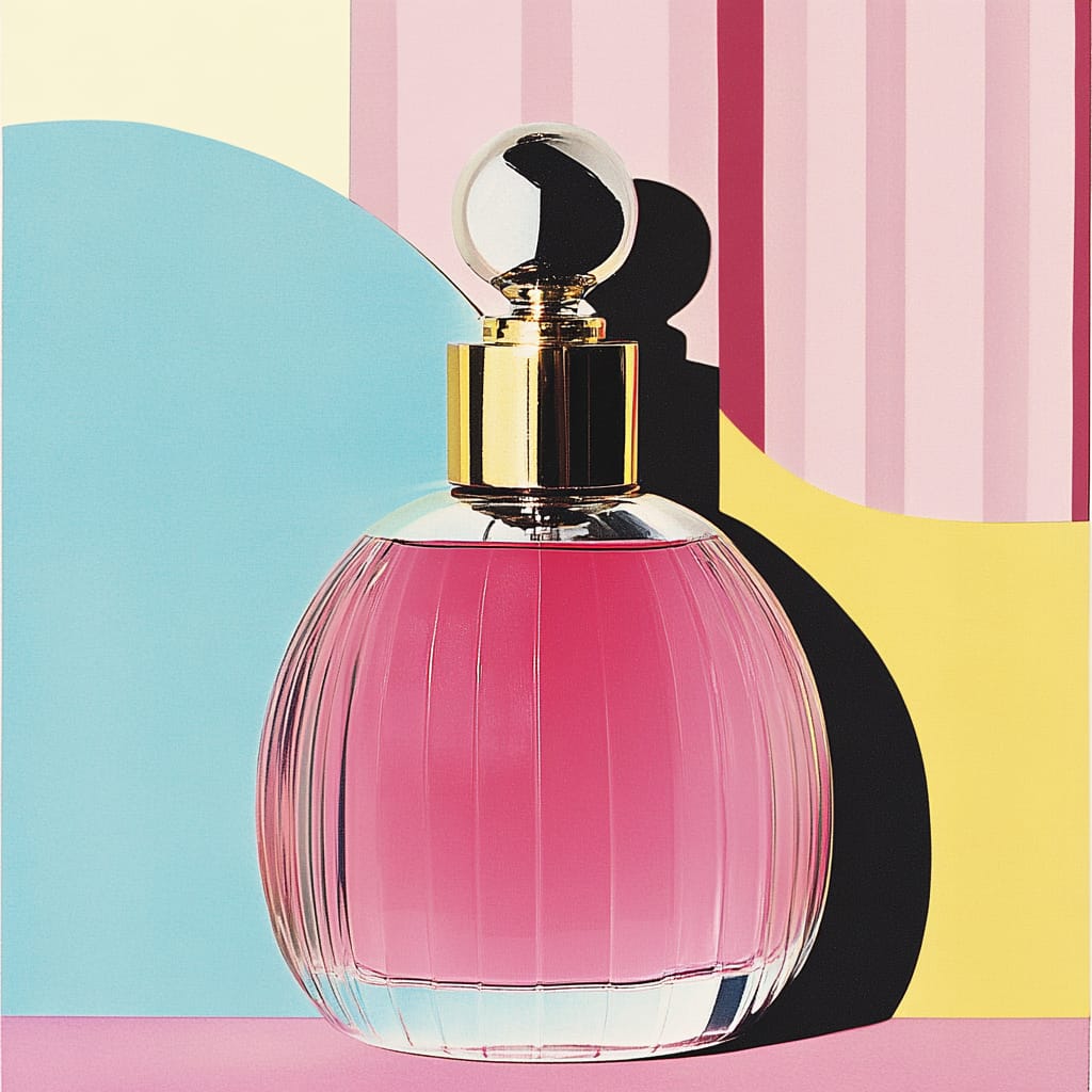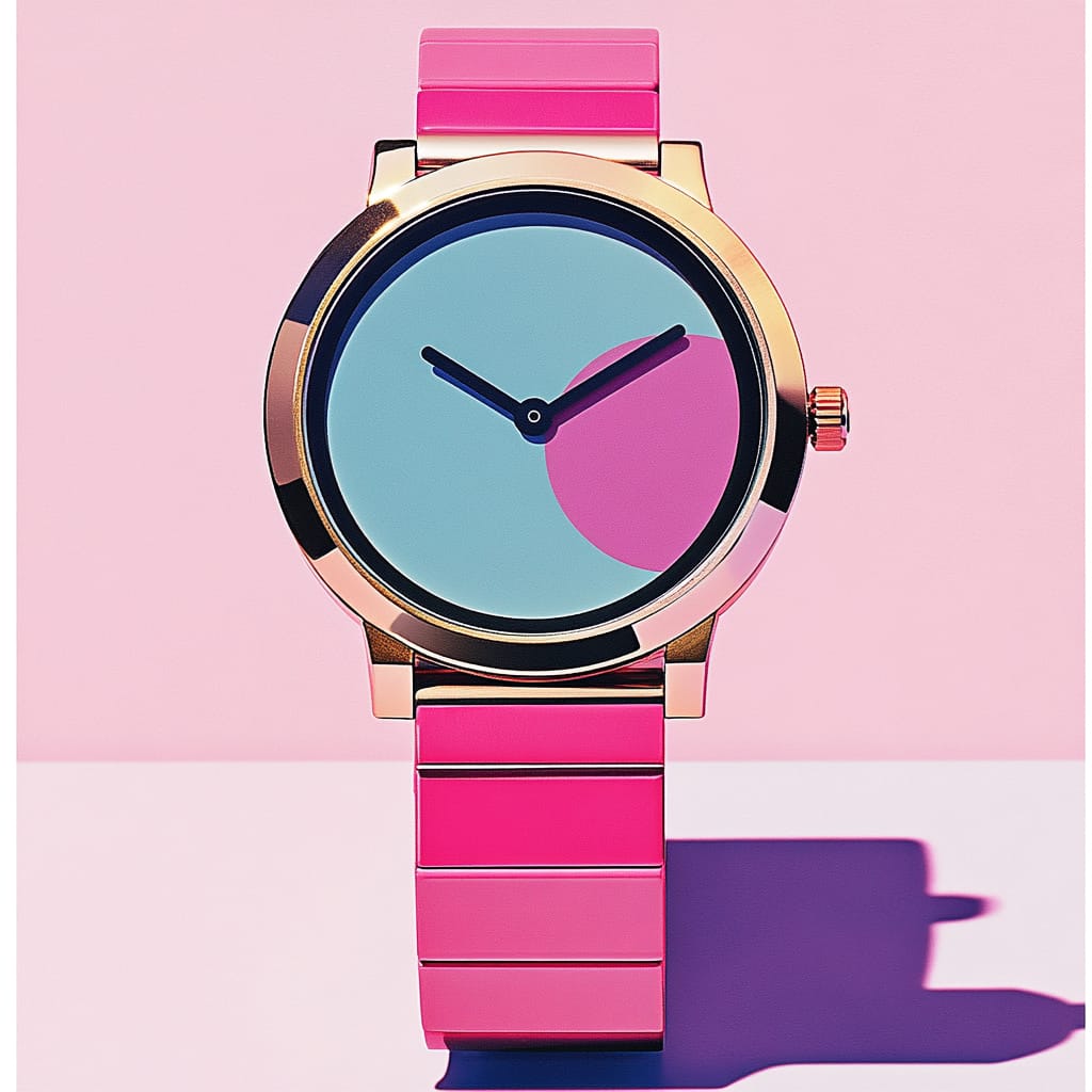 具有鲜明的现代主义设计特征,通过大胆的色块搭配和简约几何构图展现出强烈的视觉冲击力。画面以高饱和度的粉色、金色和冷暖对比色(如蓝色和黄色)为主,突出了时尚的张力和优雅的质感。这种画风将精致的材质表现与极简的形式美学相结合,每个物件的表面处理都体现出光泽与细腻细节,如晶体的闪耀、金属的光滑以及玻璃的透明度,展现出奢华的质感。构图上注重对称性与平衡感,巧妙运用色块背景和阴影对比,强化了空间感与层次感。整个画面以平面化的设计手法传递现代感,同时通过材质的细节增强了观者的触觉联想。总体而言,这种画风非常适合用于高端时尚商品、奢侈品广告及精品包装的视觉表现,能够在简洁与奢华之间找到完美平衡。
