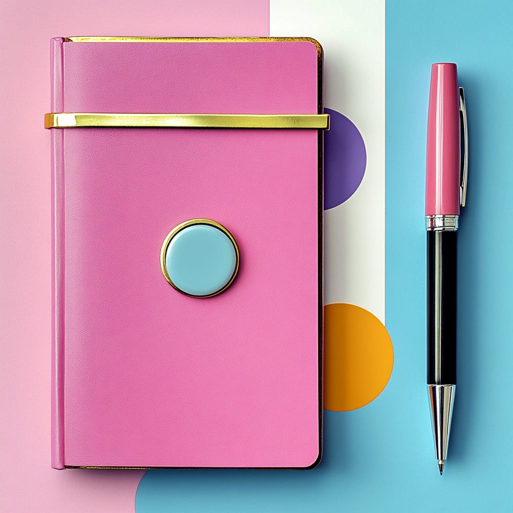 - A sophisticated pink notebook with golden-edged pages, placed alongside a matching pen on a clean pastel workspace with complementary decor elements. --sref 463788918 --v 6.1 --stylize 200