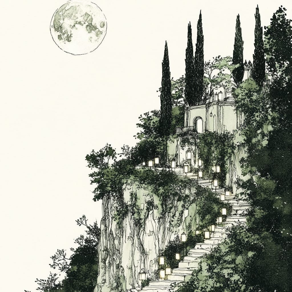 - A breathtaking view of a cliffside sanctuary adorned with cascading gardens and soft glowing lanterns, under a full moon painted with soft ink details and muted watercolor tones of sage green, moonlit silver, and midnight blue --sref 427287955 --v 6.1 --stylize 200