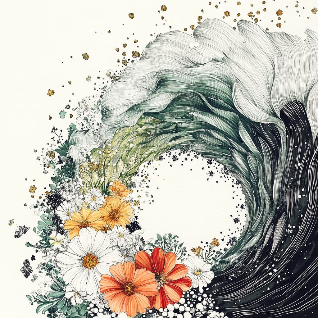 - A dynamic swirl of celestial ribbons and blooming flowers, their edges glowing with subtle light, rendered in delicate ink patterns and soft watercolor shades of azure, golden amber, and soft coral --sref 427287955 --v 6.1 --stylize 200