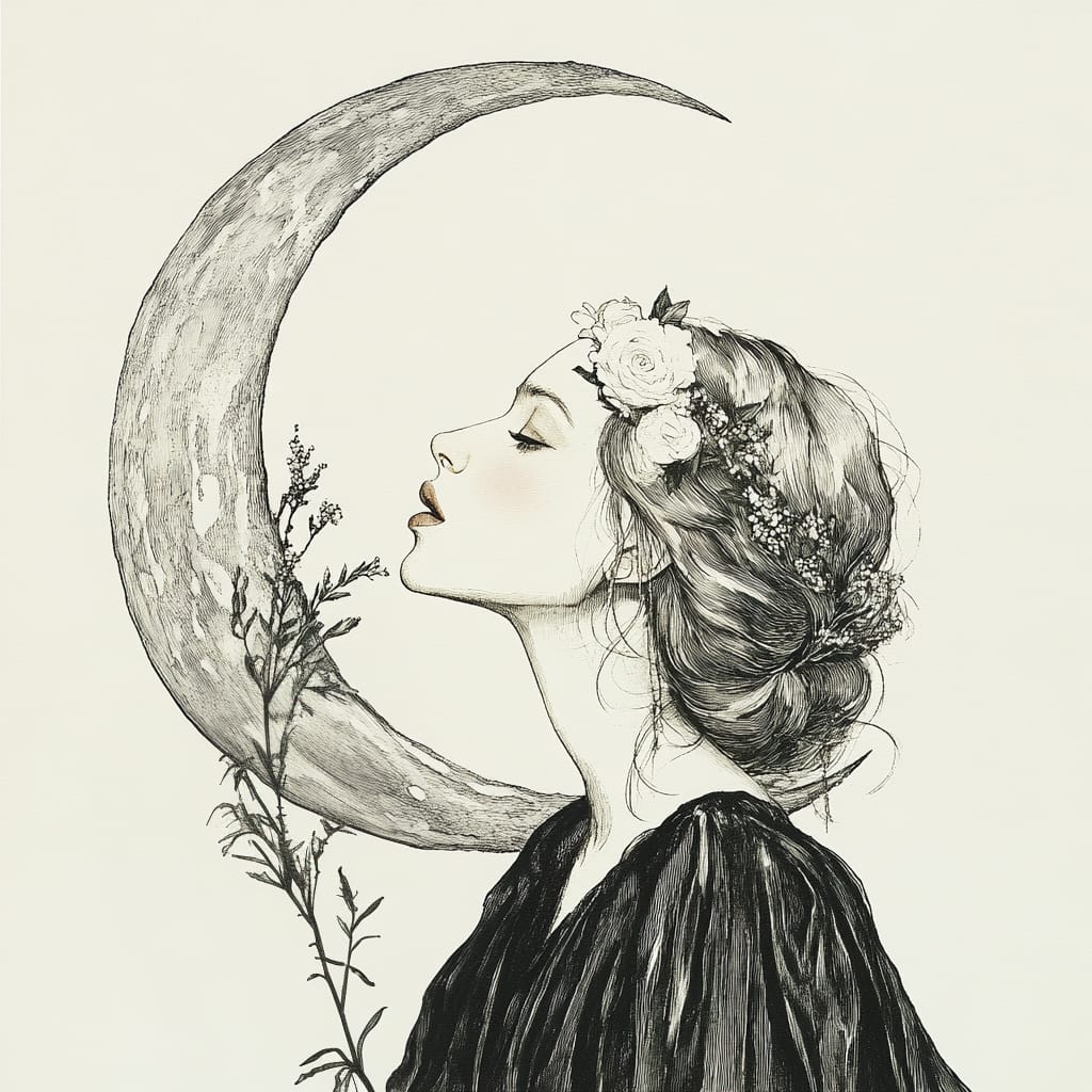 - A young woman dressed in flowing, celestial robes, she sings under a crescent moon, her hair shimmering with soft silver and gold accents --sref 427287955 --v 6.1 --stylize 200