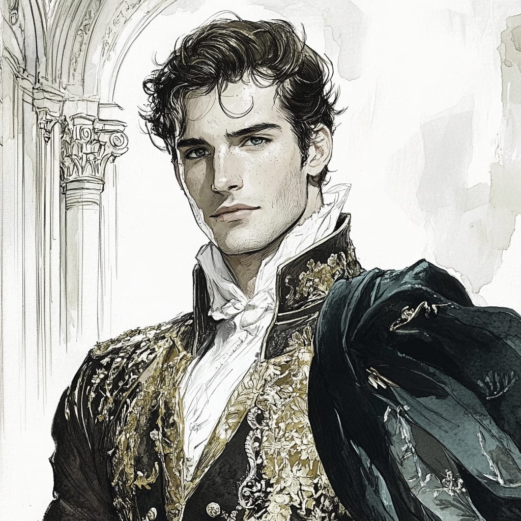 - A regal portrait of a handsome prince, his sharp, chiseled features exuding confidence and nobility. His piercing eyes reflect strength and determination, framed by neatly styled dark hair. He is dressed in an ornate royal suit with intricate embroidery in gold and sapphire blue, complemented by a flowing velvet cape draped over one shoulder. A faint glow surrounds his figure, emphasizing the richness of his attire and the polished armor beneath. The background subtly hints at a grand royal hall with towering pillars and soft light filtering through stained glass, adding depth and majesty to his presence --sref 427287955 --v 6.1 --stylize 200