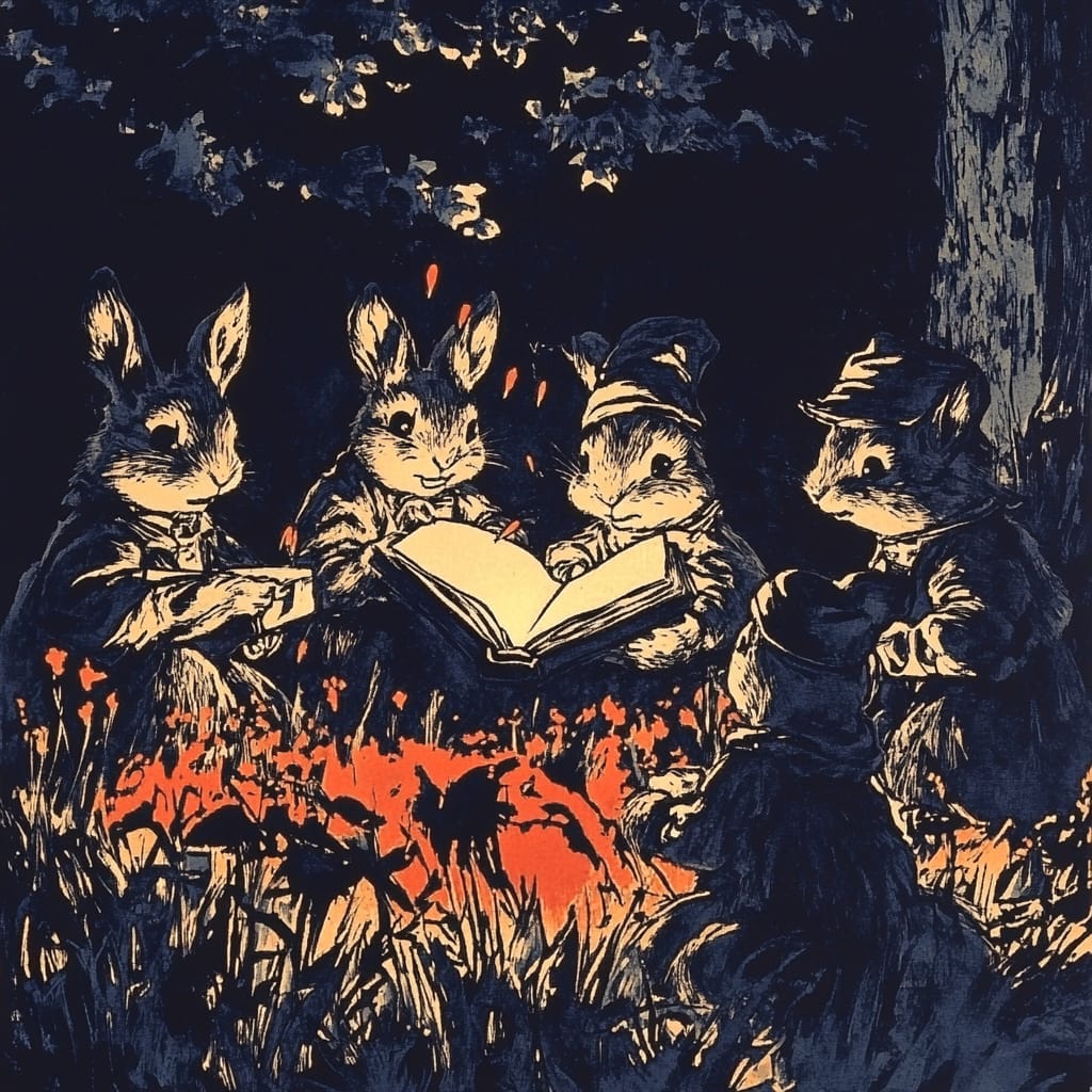 - A glowing meadow under a twilight sky, where animals wearing tiny hats gather around a magical book that emits soft golden light --sref 132311052 --stylize 200