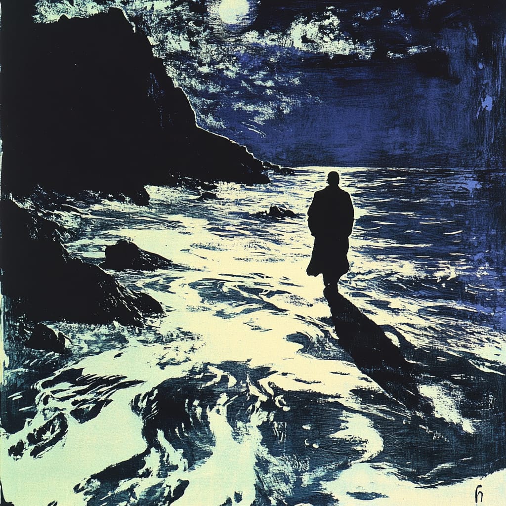 - A mysterious figure walking along a moonlit beach, where the waves glow faintly and form fleeting images of forgotten worlds --sref 132311052 --stylize 200