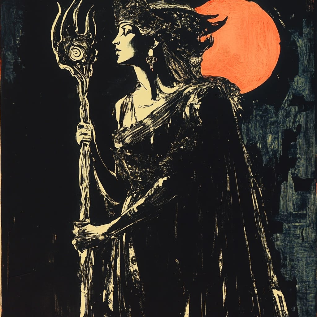 - Hekate,full body pose, symbolism, crisp lines --sref 132311052 --stylize 200