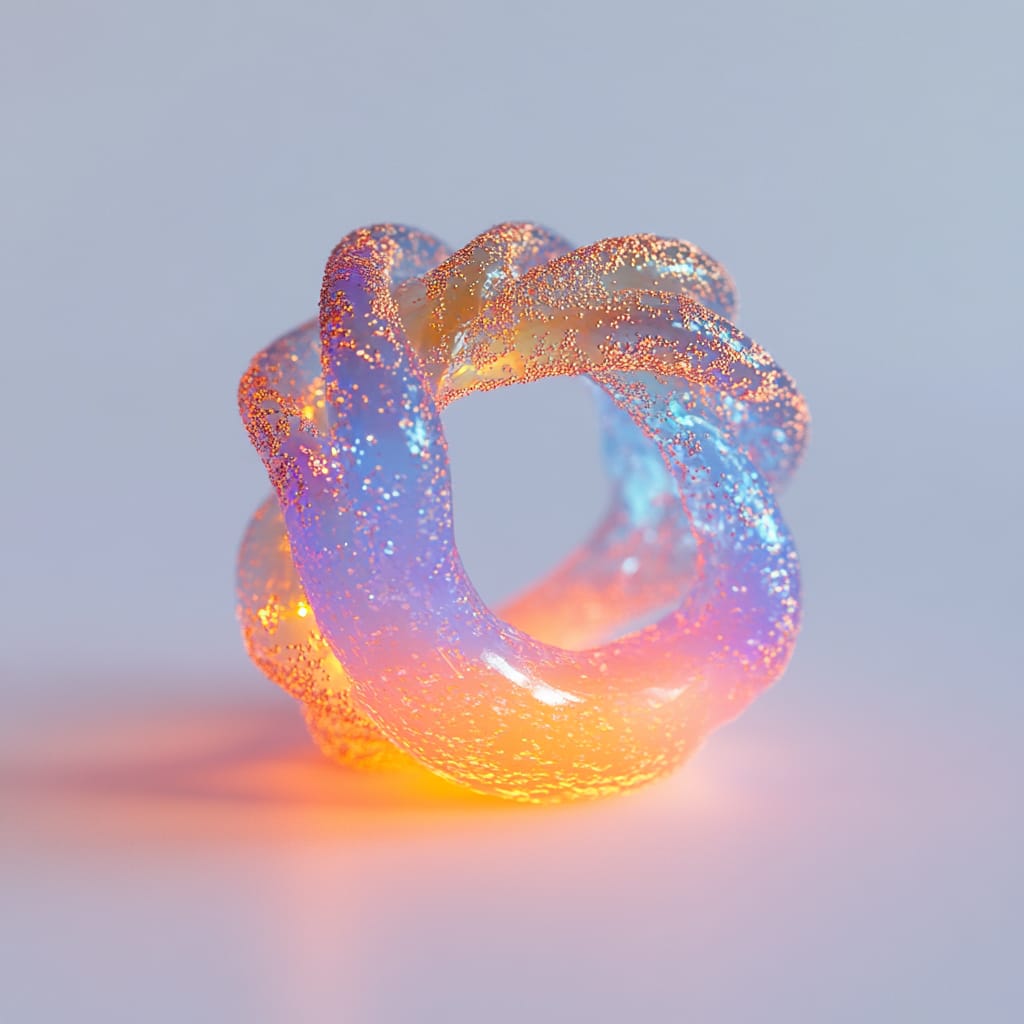 体现了一种高饱和度的梦幻视觉语言,结合渐变光影和内发光特质,呈现出柔和、细腻的质感与迷人的色彩张力。整体以蓝色、粉色、金色的渐变为主,色彩过渡流畅且富有层次感,通过冷暖对比制造空间深度和情感张力。材质表现以半透明和内发光为核心,营造出介于固态与流动之间的独特质感,类似水晶、果冻或液态玻璃,同时嵌入微小的闪光颗粒,进一步提升材质的细腻感和视觉吸引力。光影处理注重柔和边界与动态感,既强化了物体的立体造型,又模糊了边界,使画面带有一种超现实的梦幻氛围。这种风格注重细节的表现力,同时兼顾整体构图的和谐美。