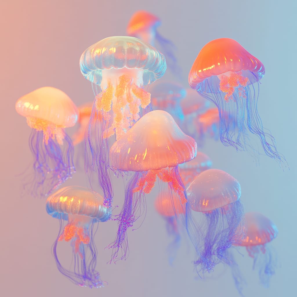 - A dreamlike scene of bioluminescent, jellyfish-like creatures gracefully floating through a softly lit oceanic sky. Their translucent bodies glow in vibrant gradients of coral and turquoise, trailing delicate, glowing tendrils that shimmer with energy --sref 962970979 --v 6.1 --stylize 200