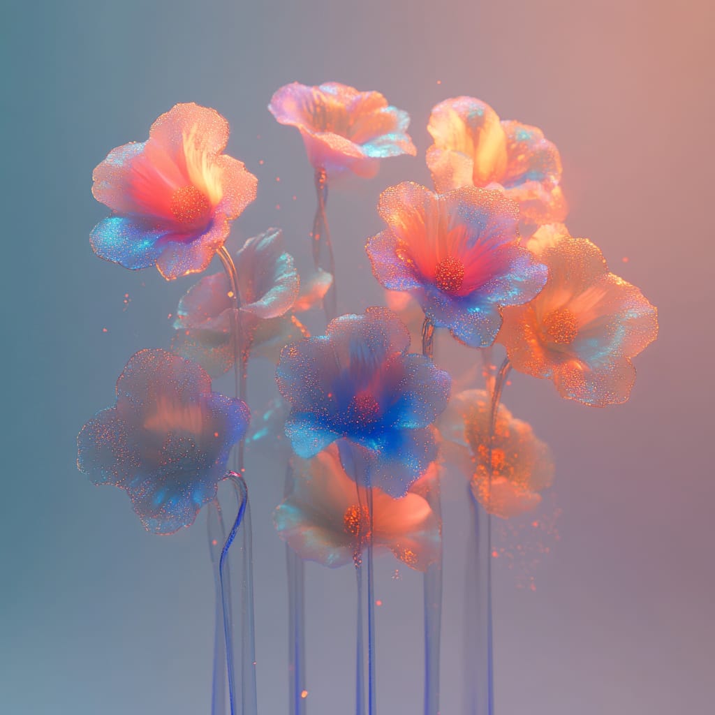 - A surreal garden filled with glowing crystalline flowers, their petals shimmering with gradients of blue, pink, and gold. Transparent stems glisten with dew-like particles, refracting soft, dreamy light. The environment is bathed in an ethereal mist with floating sparkles, creating a magical, serene atmosphere --sref 962970979 --v 6.1 --stylize 200