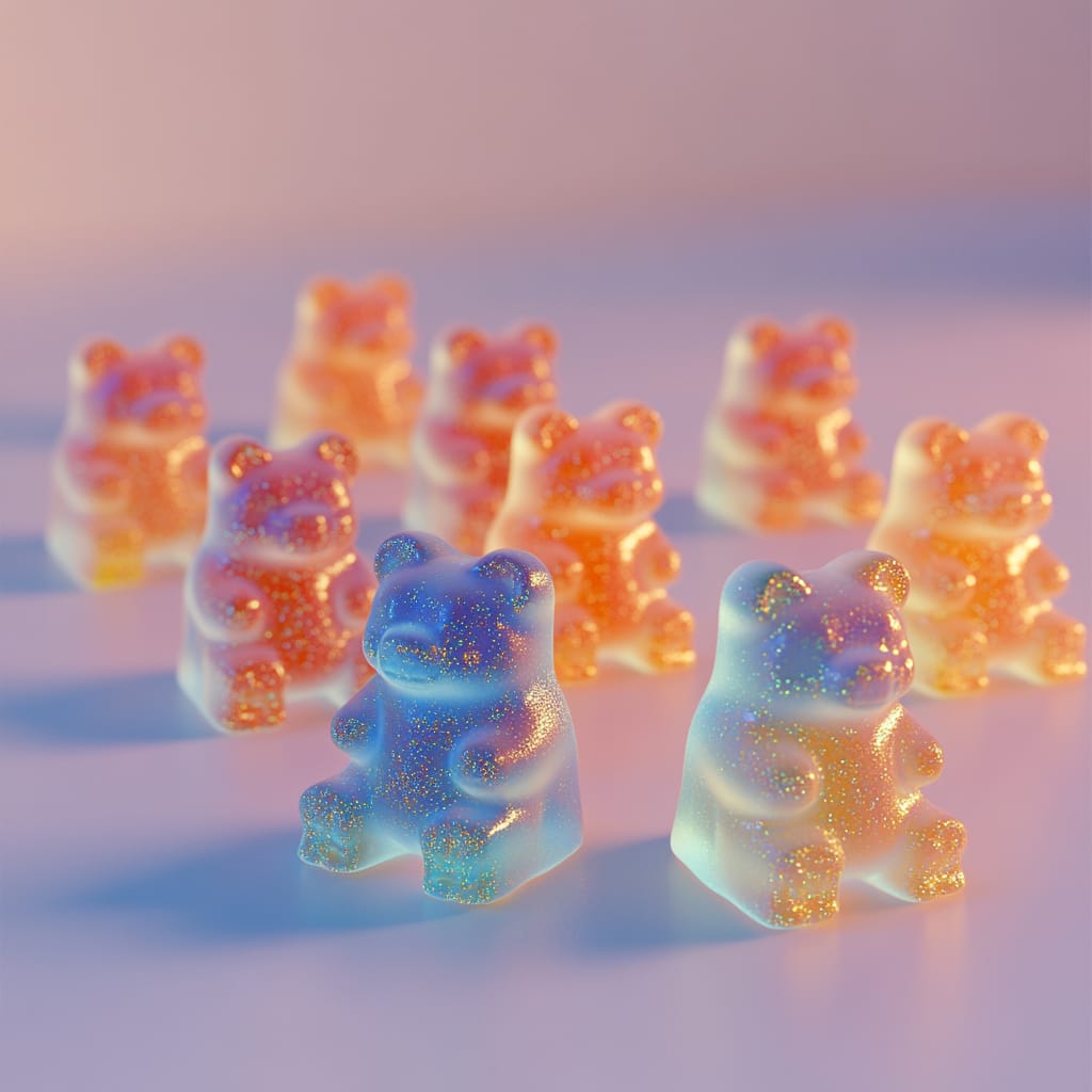 - A collection of translucent gummy bears with a galaxy-inspired design, featuring vibrant gradient colors blending from deep blue to warm gold. Each bear sparkles with embedded edible glitter, creating the illusion of tiny glowing stars within their bodies --sref 962970979 --v 6.1 --stylize 200