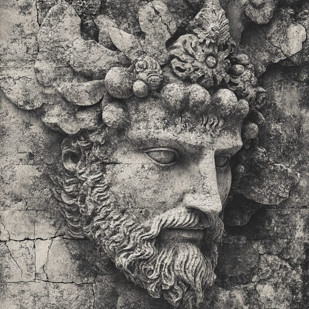 - A close-up of a massive stone relief depicting a mythical figure, with fine textures and dramatic shadows emphasizing its timeless grandeur --sref 510403667 --stylize 200