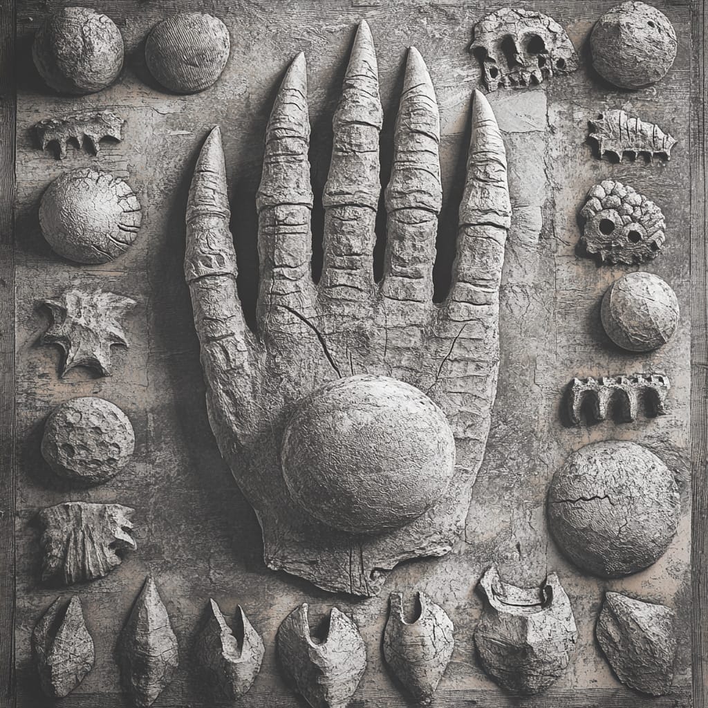 - A central display of a giant fossilized claw clutching a glowing orb, surrounded by fragmented fossil pieces in dynamic arrangements --sref 510403667 --stylize 200
