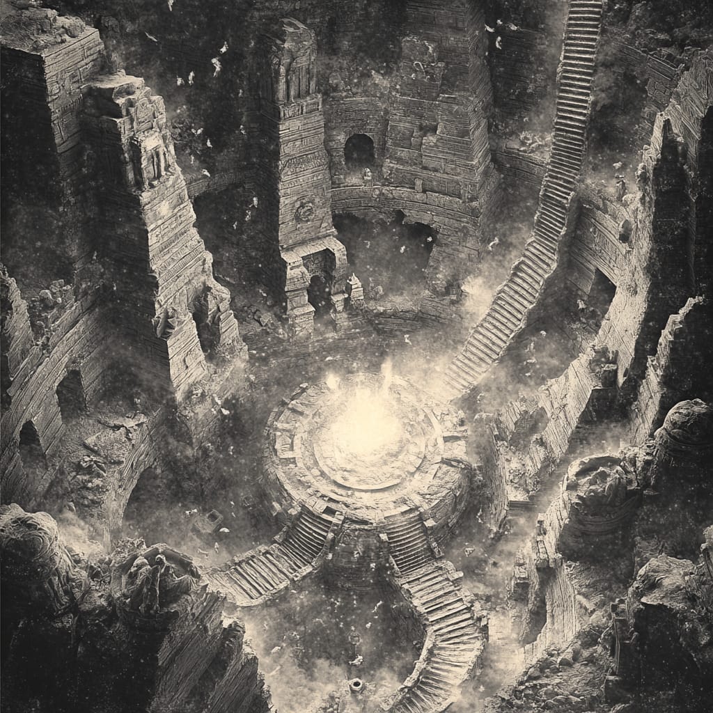 - A labyrinth of spiraling stone staircases leading to a glowing central core, surrounded by floating shards of broken statues and ruins --sref 510403667 --stylize 200
