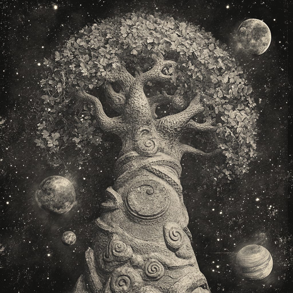 - A towering stone tree with intricate carvings on its trunk and branches; glowing leaves drift through a sky filled with distant planets --sref 510403667 --stylize 200