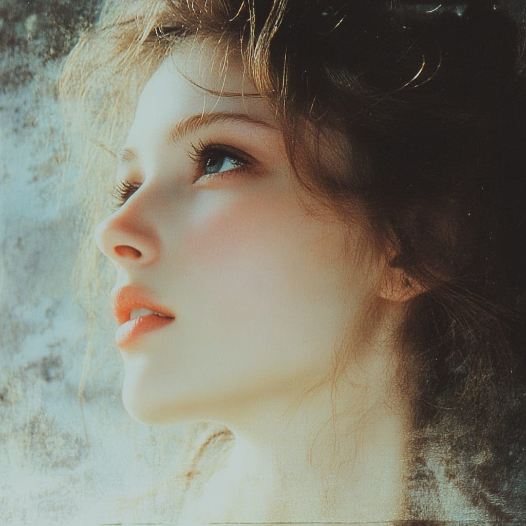 - A close-up portrait of a woman with delicate features, her gaze directed sideways; soft light highlights her hair and face, blending into a dreamy, textured background --sref 2581180571 --stylize 200