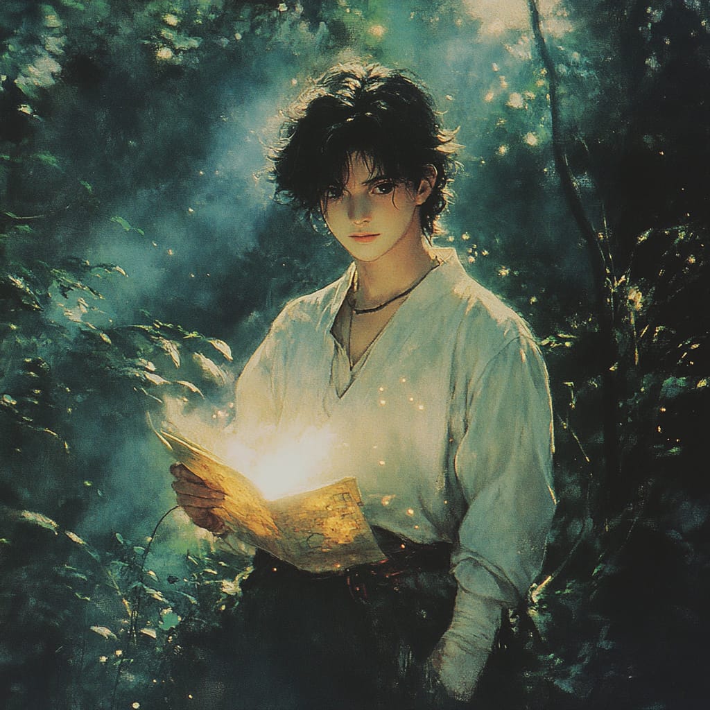 - A young adventurer holding a glowing map, standing in the center of a dense, enchanted forest; their expression is a mix of curiosity and determination as light filters through the leaves above --sref 2581180571 --stylize 200