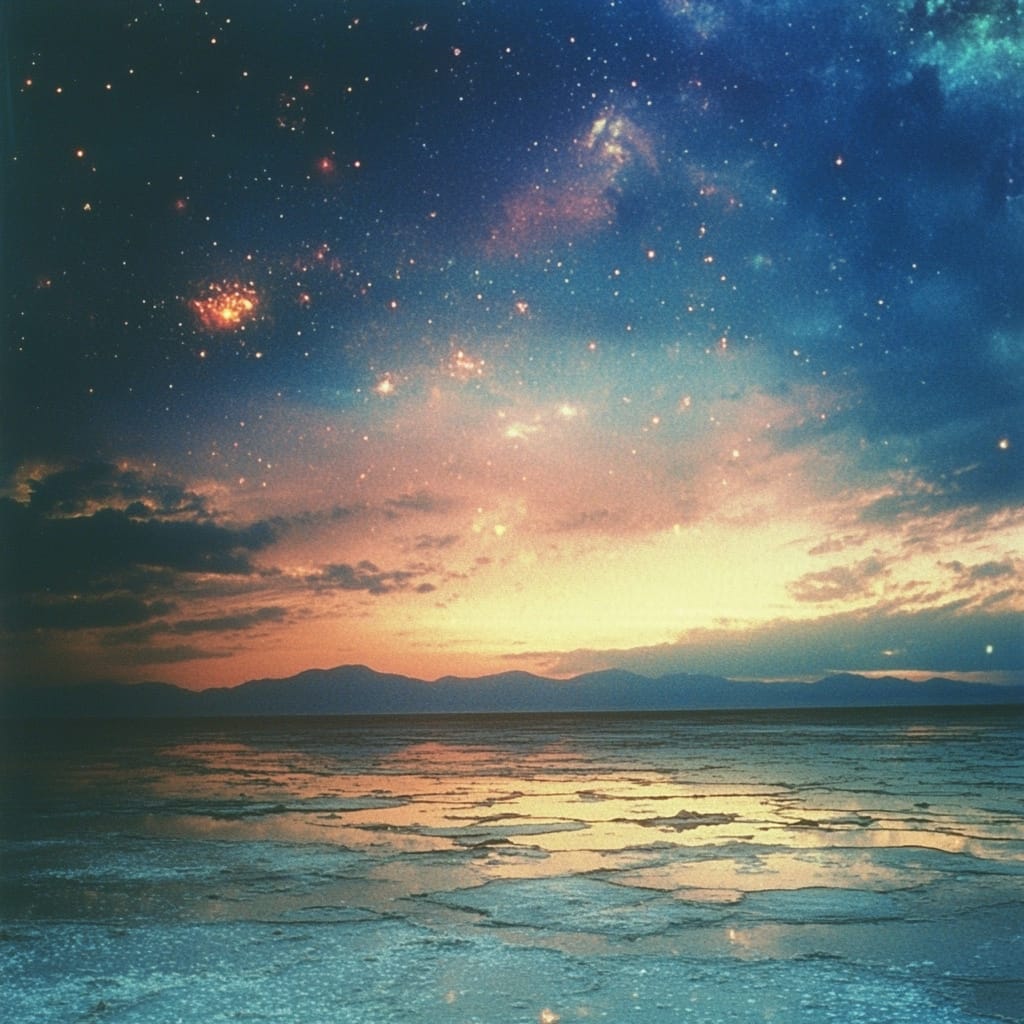 - a vast, cracked salt plain under a swirling, multicolored sky; faint reflections of the cosmos ripple on the surface, blending reality and fantasy --sref 2581180571 --stylize 200
