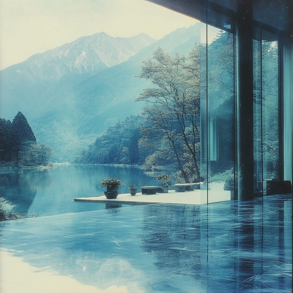 - An ultra-modern glass pavilion perched on the edge of a serene mountain lake; the building reflects the surrounding peaks and trees, creating a seamless blend with nature --sref 2581180571 --stylize 200