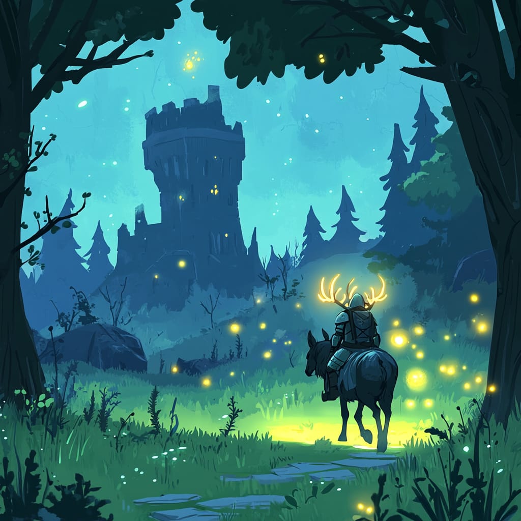 - A lone knight riding a glowing stag through a moonlit forest, their armor faintly shimmering with ethereal light, the stag’s antlers casting soft golden rays, tiny fireflies lighting the path ahead, ancient ruins peeking through the mist, and a quiet, otherworldly calm hanging over the forest as the knight makes their way toward a distant glowing castle --sref 73221953 --stylize 200
