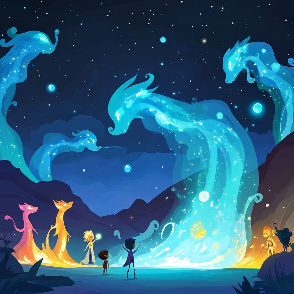 - A nomadic circus in the middle of glowing dunes under a star-drenched night sky. Ethereal performers drift through the air, their costumes shimmering like ghostly flames, while glowing sand cascades from their movements. A young onlooker is pulled into the performance by a mischievous juggler tossing glowing orbs, as ghostly animals--floating elephants, fiery phoenixes--circle the audience --sref 73221953 --stylize 200