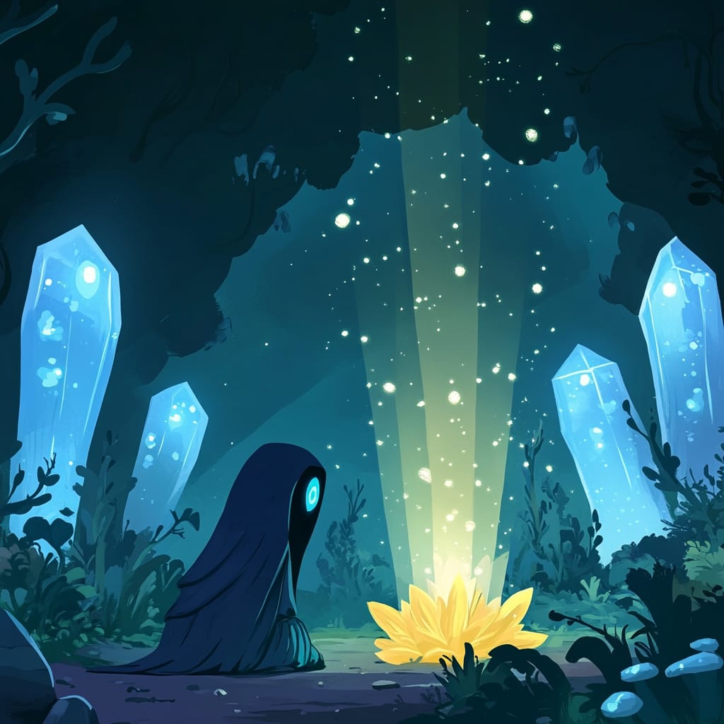 - A surreal landscape of glowing crystal flowers stretching endlessly under a dark teal sky, their petals radiating soft light. At the center, a mysterious, hooded figure with glowing blue eyes kneels, guarding a radiant flower that emits beams of golden light. Gentle ghostly apparitions float among the blossoms, their forms reflecting the light, creating an atmosphere of beauty and mystery --sref 73221953 --stylize 200