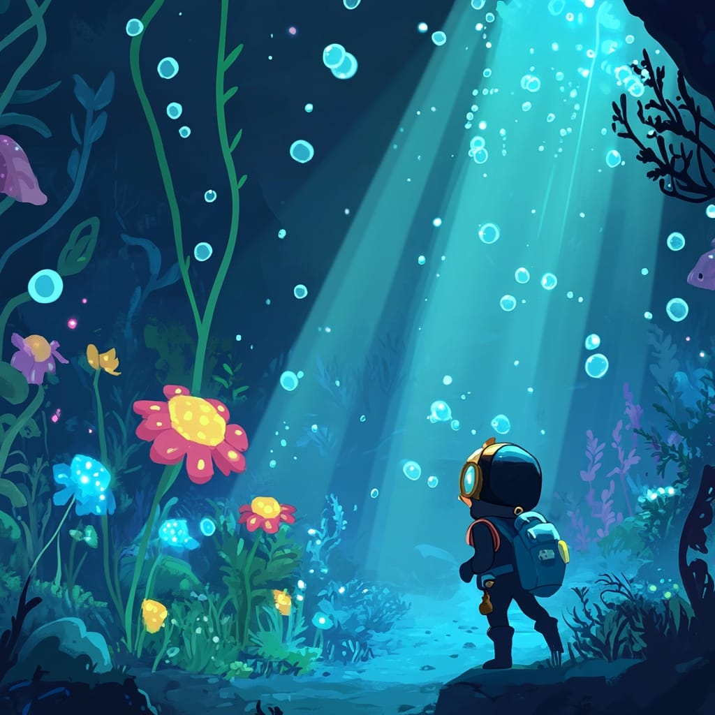 - A breathtaking underwater scene where bioluminescent flowers grow from the ocean floor, glowing in hues of blue, teal, and purple, a curious diver in a vintage suit gazing in awe at the garden, small glowing fish swimming in schools, rays of moonlight filtering through the water, and delicate bubbles rising from the flowers, creating a tranquil and surreal atmosphere --sref 73221953 --stylize 200