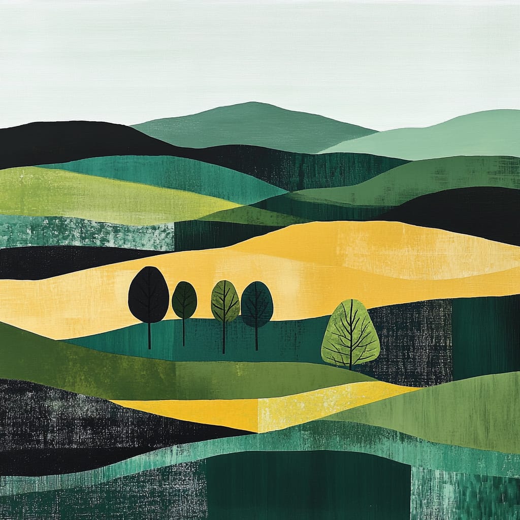 - A serene abstract landscape with rolling hills in shades of green and yellow, minimalistic black tree silhouettes forming a focal point, and a soft gradient sky for a harmonious composition --sref 50468391 --v 6.1 --stylize 200