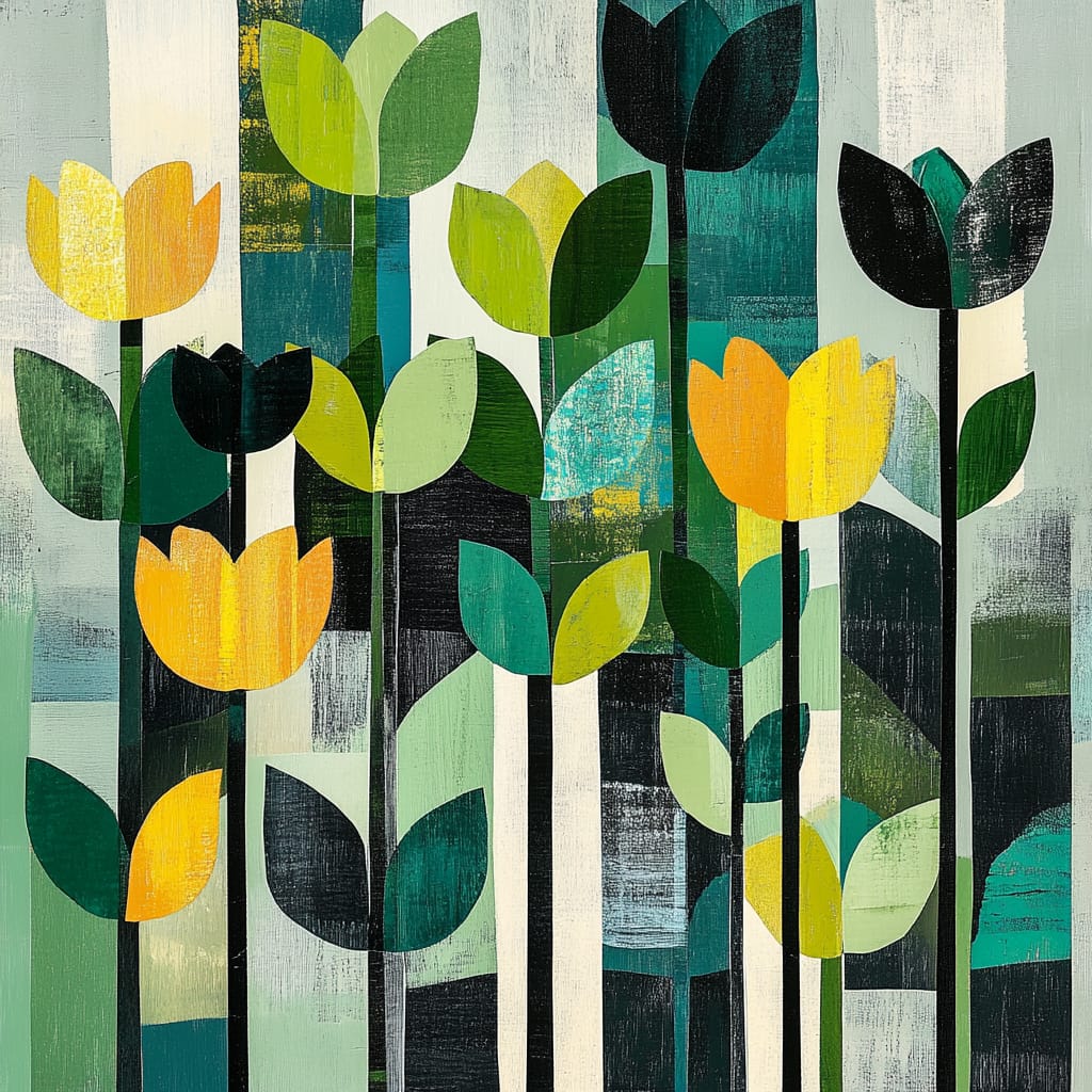 - A stylized garden with bold geometric flowers in shades of green and yellow. The flowers vary in shape and size, with long stems and overlapping petals creating a dynamic flow that contrasts against a softly textured background. --sref 50468391 --v 6.1 --stylize 200