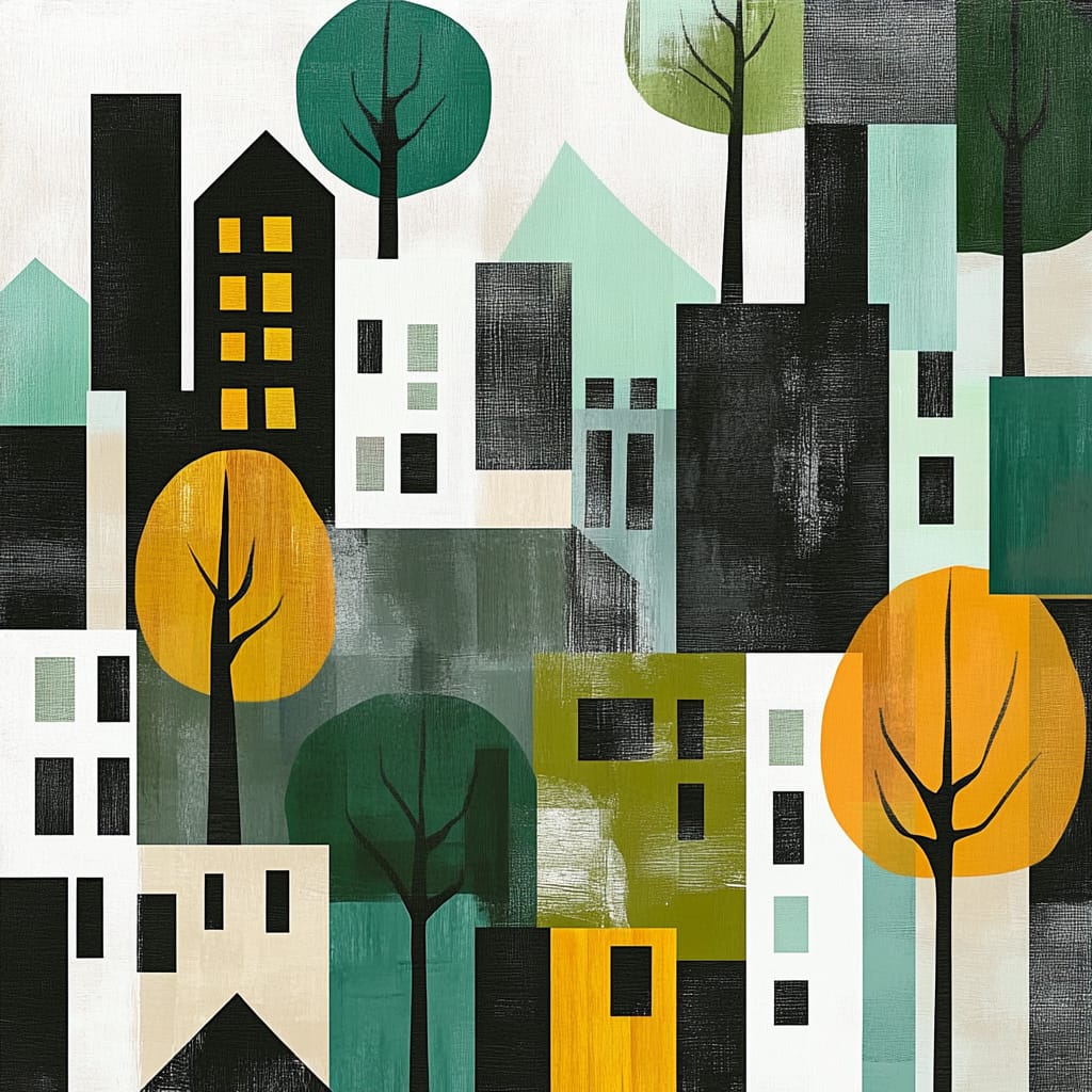 - A geometric cityscape with minimalistic trees seamlessly integrated into the background; the trees are stylized with clean shapes and vivid colors to create a harmonious contrast against the muted buildings. The scene features a balanced composition with strategic use of negative space, emphasizing a calm and modern aesthetic --sref 50468391 --v 6.1 --stylize 200