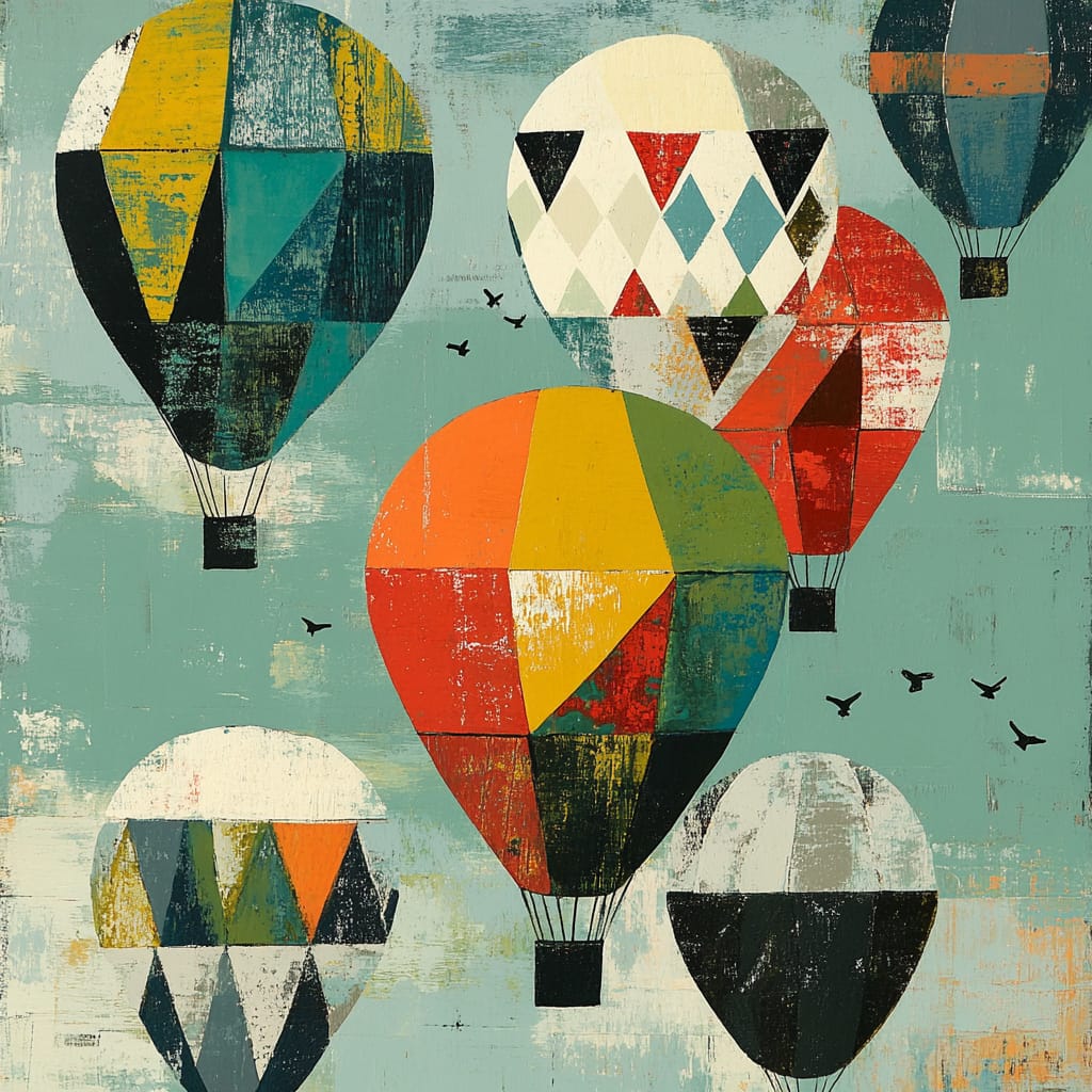 - Floating hot air balloons with spherical tops segmented into vibrant geometric patterns--reds, yellows, and blues--contrasting with soft, muted pastel skies. Thin, angular strings attach to trapezoidal baskets, while small triangular birds dot the expansive backdrop, adding a playful sense of adventure --sref 50468391 --v 6.1 --stylize 200